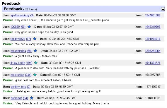 C.A. Dewsbury "An ideal place to explore all parts of Scotland" S.L Pudsey "A good base to explore the Highlands and see the sights. Thank you for making our stay so enjoyable" K.S. Leeds "Nice, relaxing break. Plenty to see and do" C.A. W. Yorks "Excellent base for exploring the Inverness and Ross-shire county. Clean, friendly and excellent value for money" N.M. Argyll "We've seen all-sorts of wildlife up here. Eagles, dolphins, seals, kites, baby rabbits and next doors baby ducks. The kids loved it" E.J. Halifax "Excellent value holiday in the most amazing surroundings, with easy access to lots of interesting and breathtakingly beautiful sights. Thanks for a great holiday - We'll be back" A.G. Halifax And they did come back - 2 holidays with us in one year!! "Large, well equipped chalet offering excellent value and a central base when exploring the Highlands and Islands" P.F. Morley And just checkout some of the feedback we've received from Ebay, the internet auction site: |